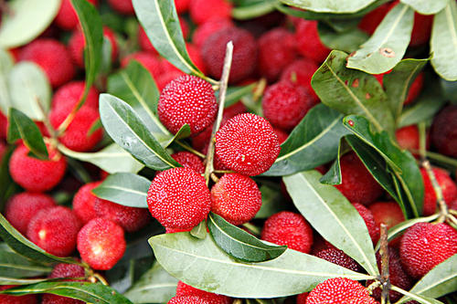 28、杨梅长熟了刺就变软了,摘一个下来吃在嘴里滑滑的软软的。杨梅先是淡红的,之后变成深红,几乎是黑色的。